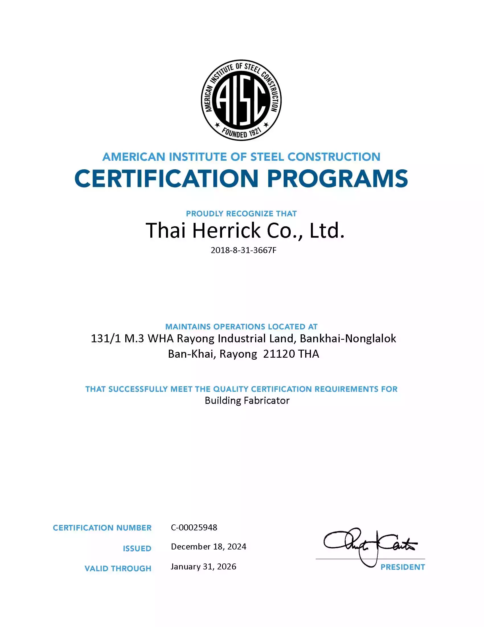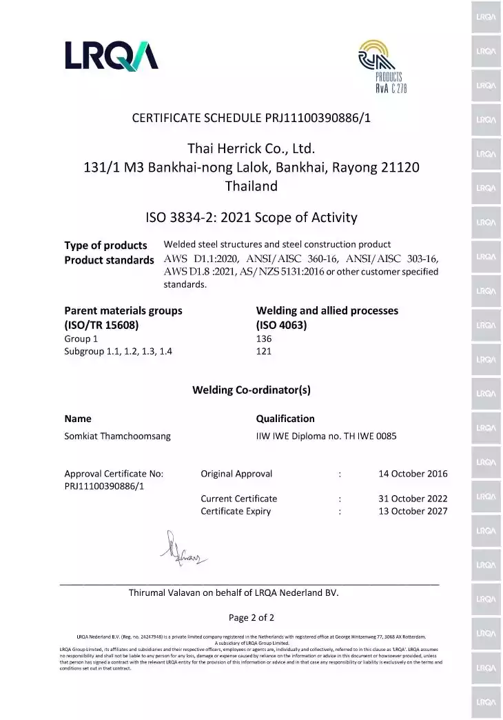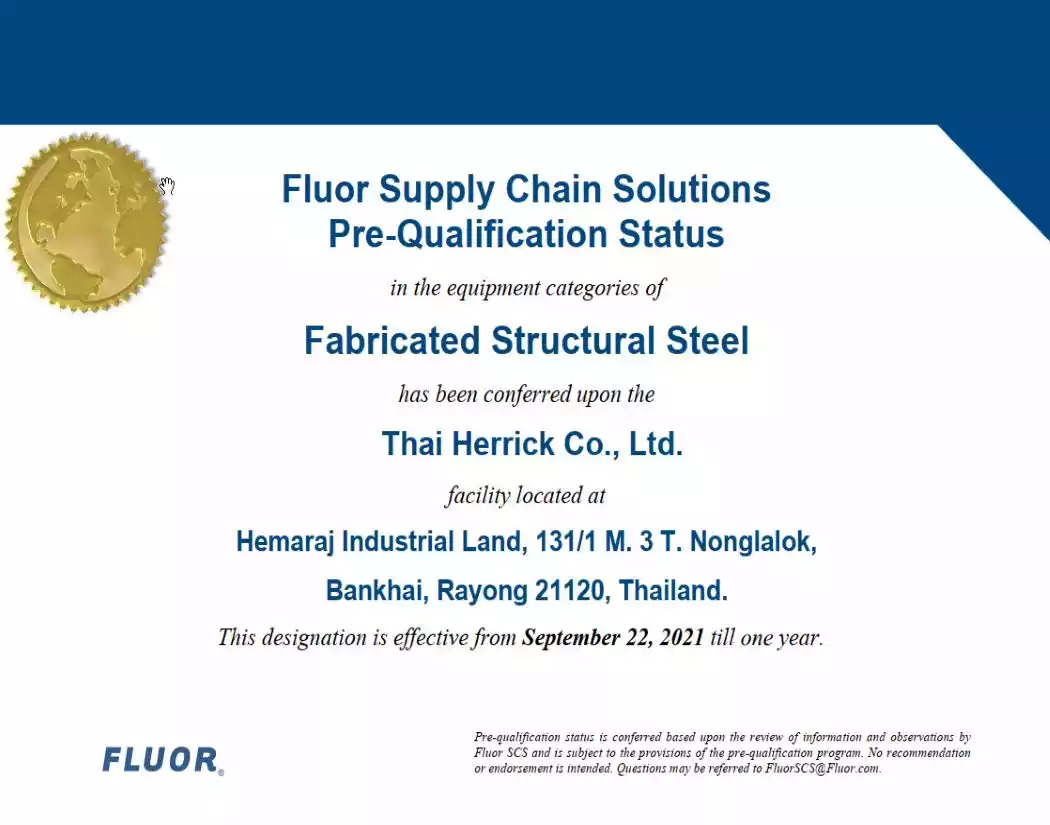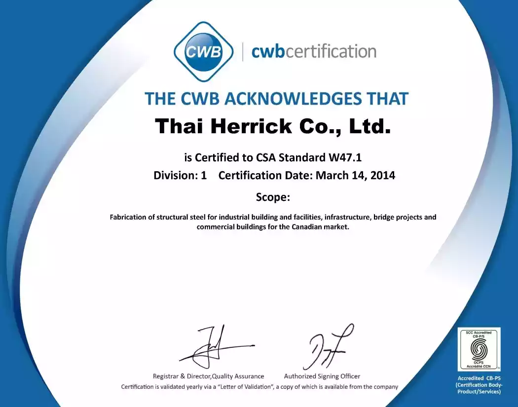At Thai Herrick, we uphold the highest standards of quality management, setting a benchmark for the industry. Our system is built upon ISO 9001:2015, AISC, AWS Standards, and other applicable industry regulations tailored to each project’s unique requirements. We ensure that every fabricated steel product meets precise project specifications and design standards with uncompromising accuracy and reliability.
